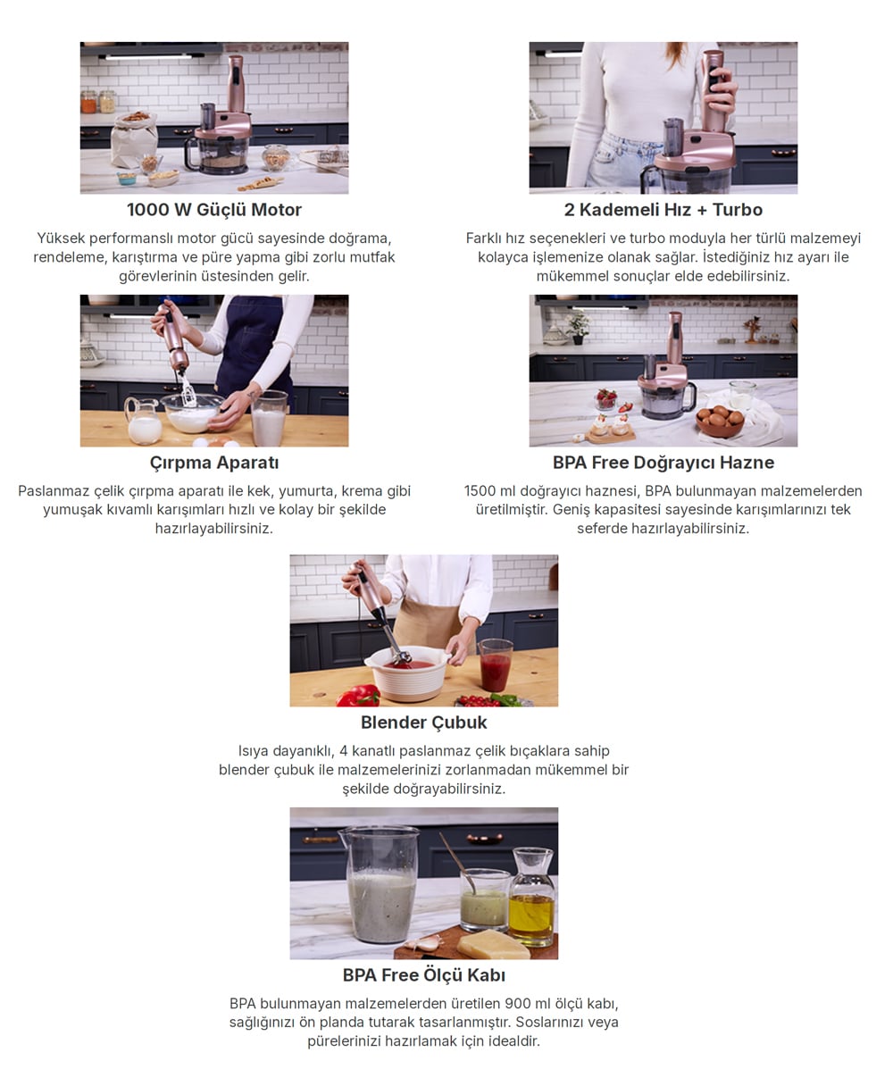 Aksesuarlar: Çelik Çırpma Teli, Çelik Blender Ayağı, Ölçü Kabı, Rendeleme Aparatı, Dilimleme Aparatı, Çelik Doğrayıcı