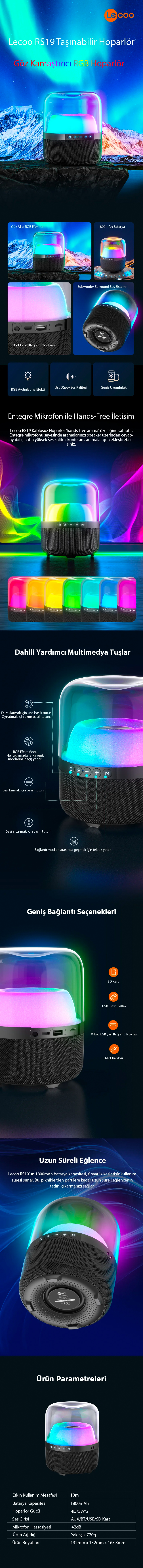 Lenovo Lecoo RS19 Kablosuz RGB Aydınlatmalı Taşınabilir Hoparlör (RS19)